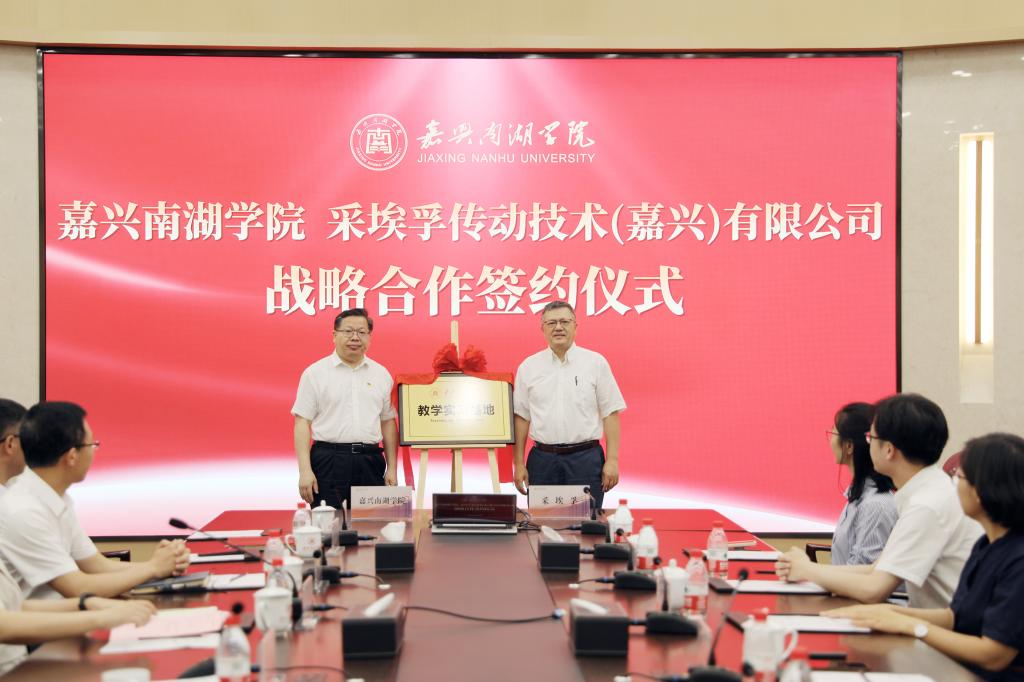 仪式上,盛付祥与廖利恒共同为校企双方共建的教学实践基地揭牌。朱蓉与廖利恒代表校企双方签订战略合作协议。2014届优秀校友、采埃孚传动技术(嘉兴)有限公司亚太区运营和物流管理分析师张伟分享了在母校就读时的青春时光以及职业成长经历。