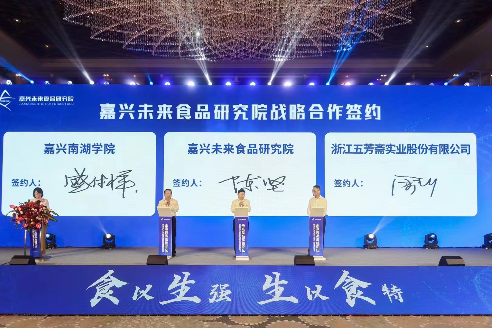 活动现场,我校与浙江五芳斋实业有限公司、嘉兴未来食品研究院签署了合作协议,三方未来将在推动高层次人才交流共享、人才联合培养、共建科研平台、产业链创新合作等方面开展战略合作,推动校企院协同创新,共同开创未来食品的高质量发展,不断满足人民对美好生活的新期待。