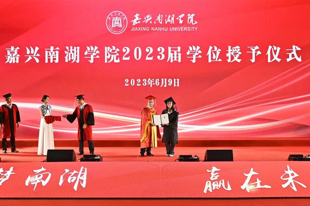 典礼结束后,举行了嘉兴南湖学院2023届学位授予仪式。在各个二级学院领导班子成员见证下,贾文胜为获得学士学位的毕业生代表拨穗正冠,颁发学位证书,并合影留念。