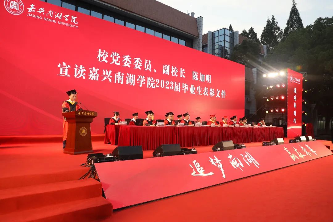 副校长陈加明宣读了嘉兴南湖学院2023届省级优秀毕业生、2023届校级优秀毕业、首届“红船证书”获得者及毕业生考研表彰名单。