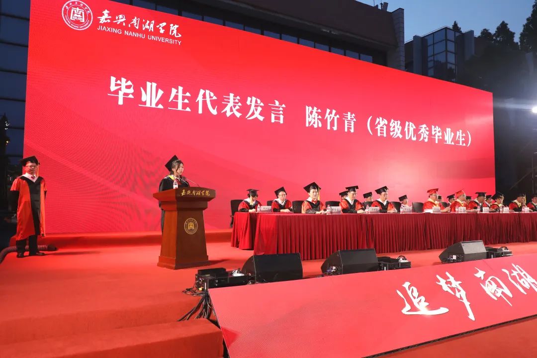“四年里,母校的发展日新月异,嘉兴的变化耳目一新,我们的成绩硕果累累”,首届红船证书获得者、2023届省级优秀毕业生、时尚设计学院陈竹青同学作为2023届毕业生代表发言,她感慨道,大学四年,大家都在这里留下了不一样的珍贵记忆,无论是傲人的成绩、难得的机遇,还是相知相惜的挚友、能携手一生的伴侣,都是人生中宝贵的财富,是收获、是感动、更是成长。