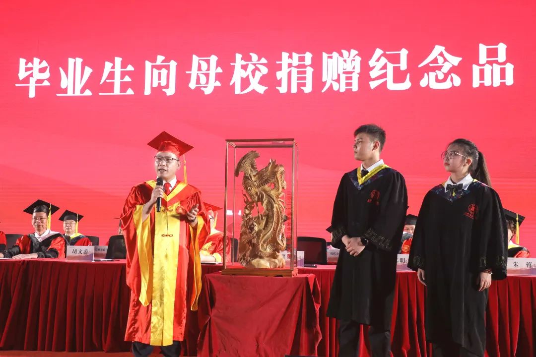校长贾文胜代表学校接受2023届毕业生代表捐赠的纪念品“凤穿牡丹根雕”,并寄语全体毕业生都能拥有美好、光明和幸福的未来。