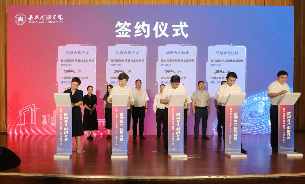 论坛上,学校正式成立科创金融发展研究院,并与浙江省创业投资协会、工商银行嘉兴分行、建设银行嘉兴分行、南湖基金小镇签订战略合作协议,同时向行业专家颁发客座教授聘书。