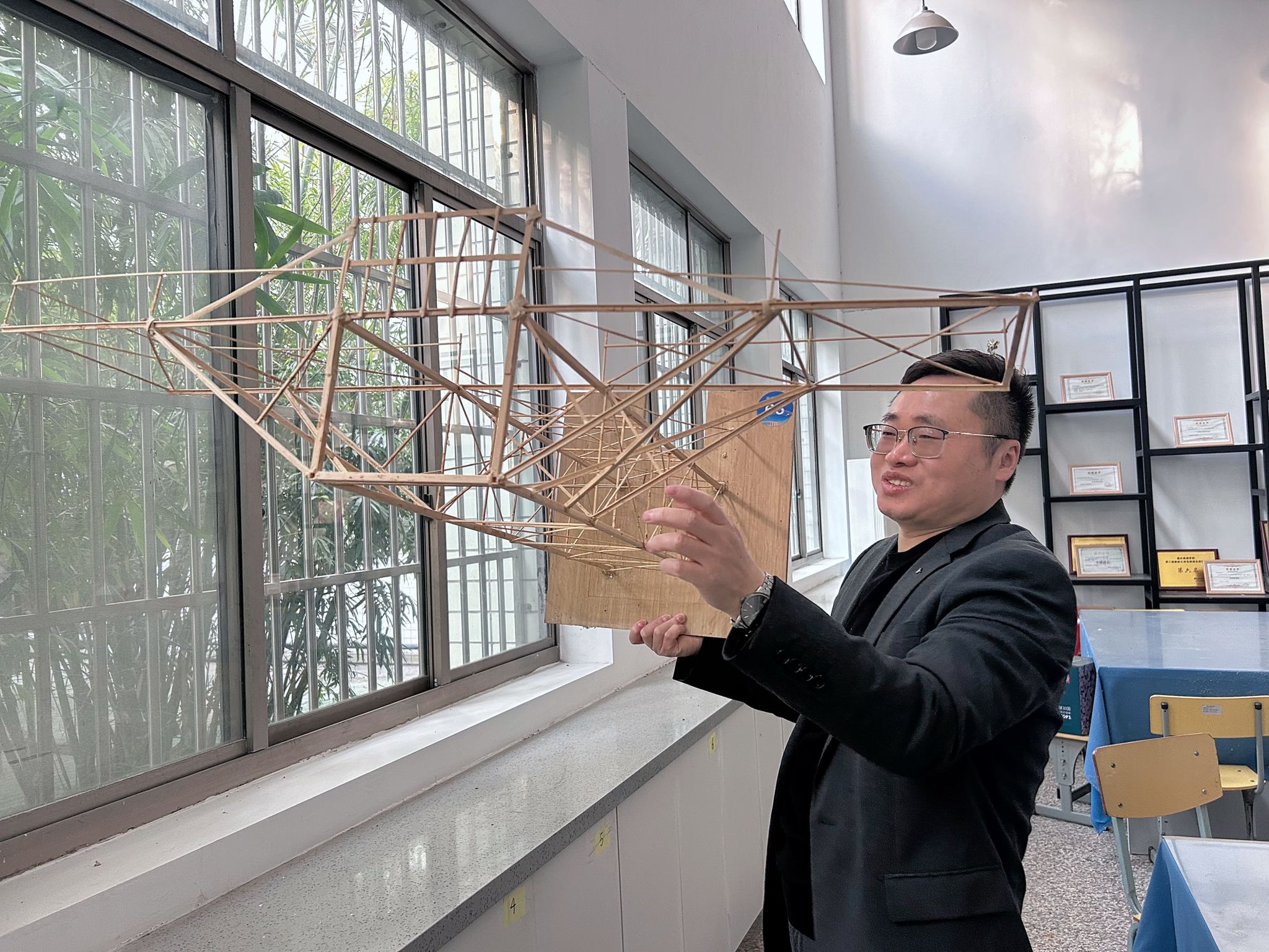 “建筑专业的学生可以参加的专业性比赛并不多,浙江省大学生结构设计竞赛是A2类省级竞赛,也是建筑领域普遍认可的学生团队赛。2014年我接到指导学生参加这项比赛的任务后,这些年就一直没间断过。”朱成拿着学生当时为了参赛制作的作品模型说。